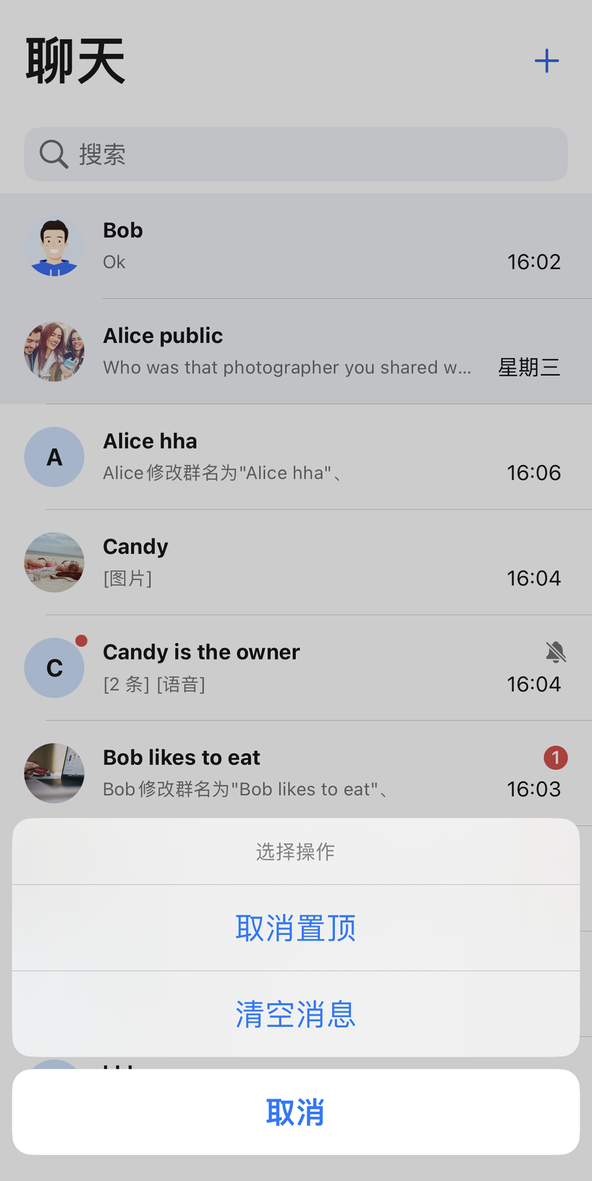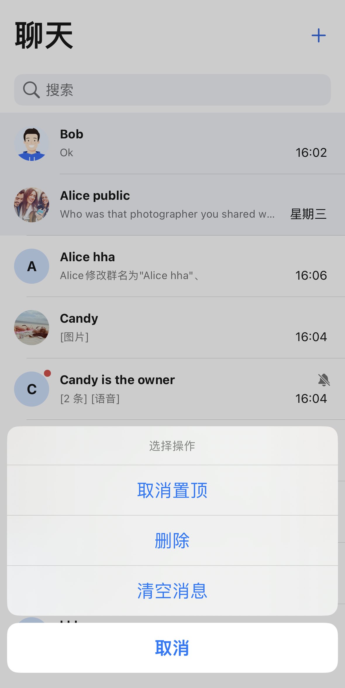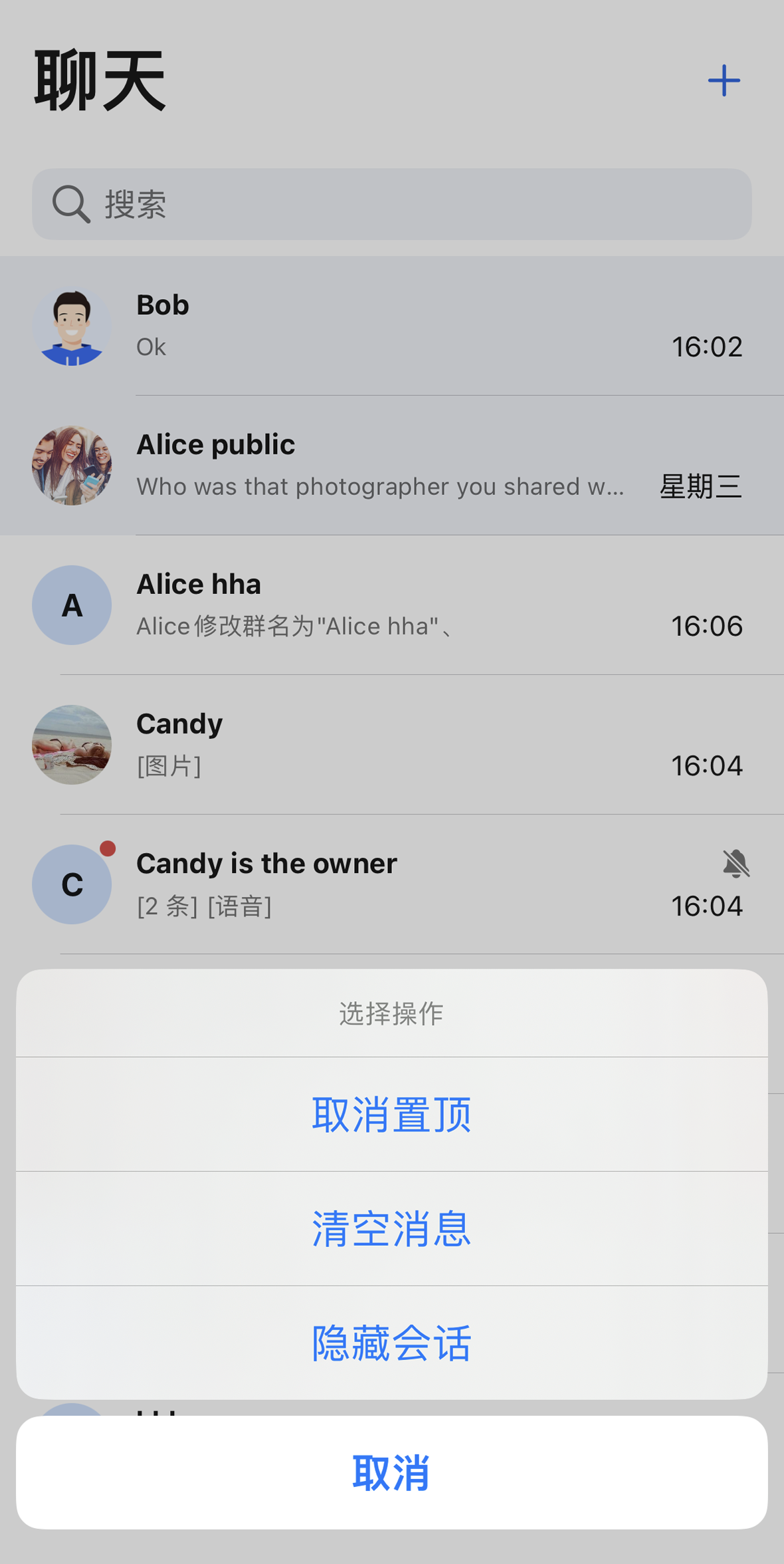 会话操作(默认选项) | 会话操作(隐藏删除选项) | 会话操作(新增隐藏会话选项) |