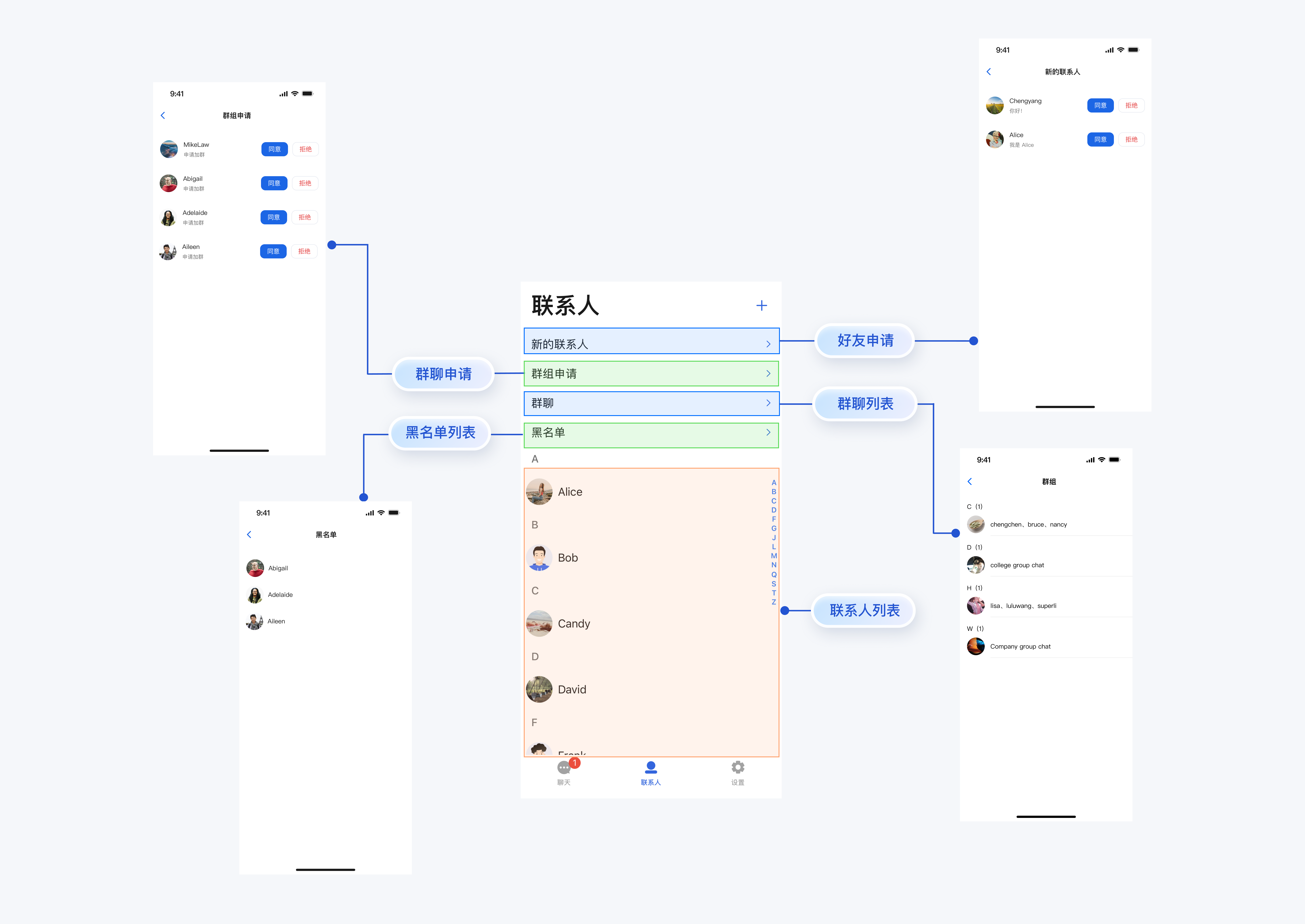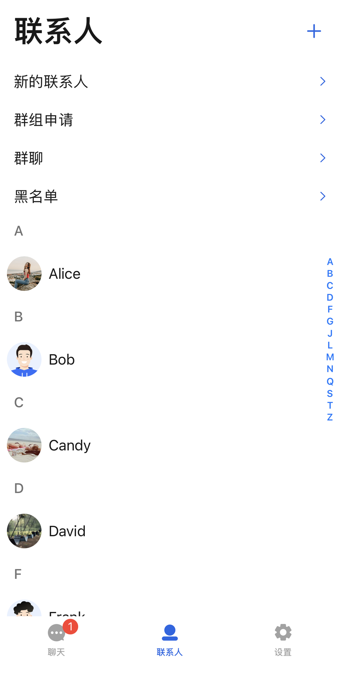 ContactList 上半部分预留了各个子视图的入口 cell,例如好友申请、群聊申请、群聊列表和黑名单列表。下半部分内嵌了联系人列表,如下图所示: