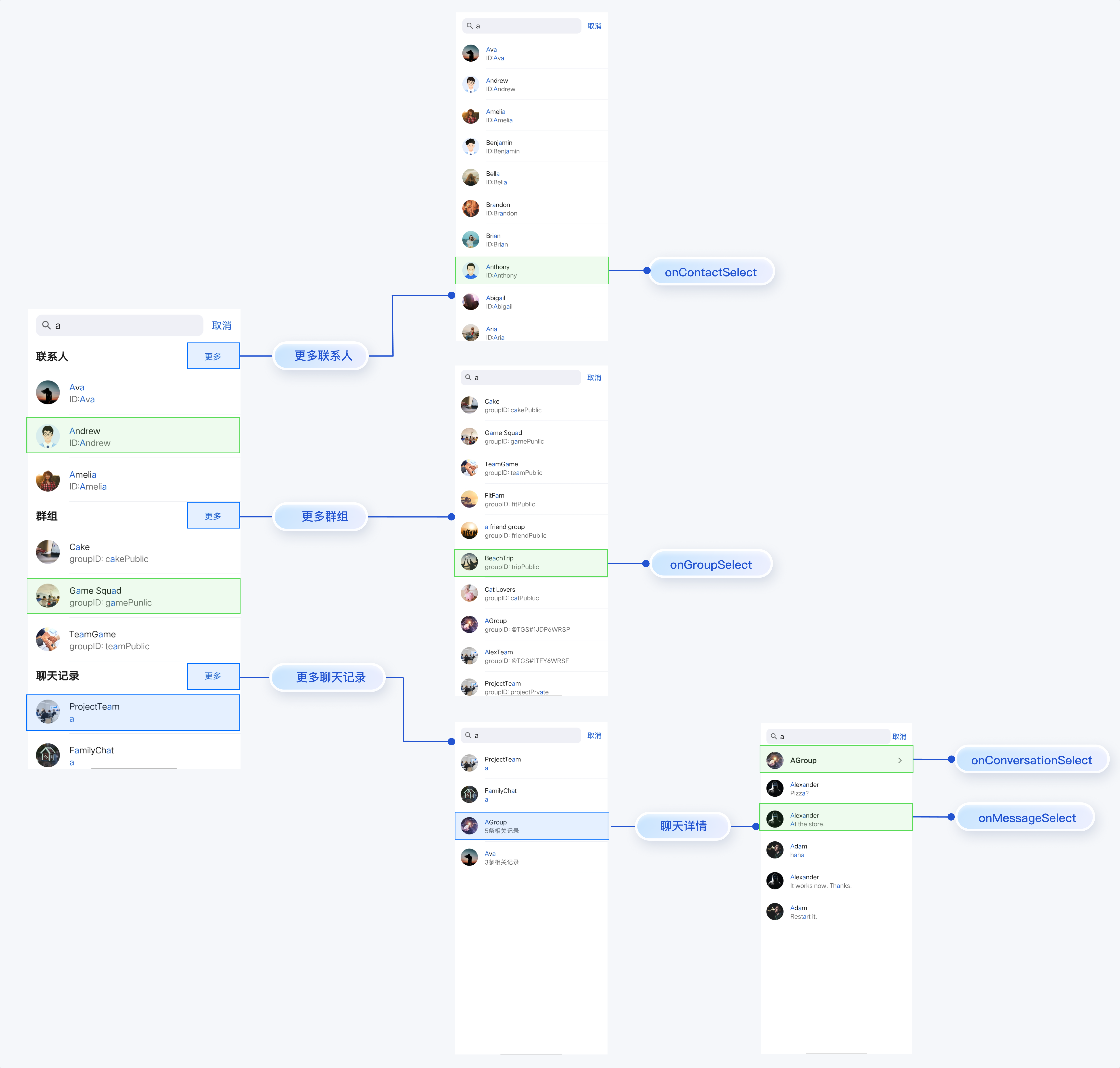 SearchBar 的搜索结果路由跳转如下:onContactSelect/onGroupSelect/onConversationSelect/onMessageSelect,需在回调中实现自定义跳转(例如跳转到您的自定义聊天界面)。