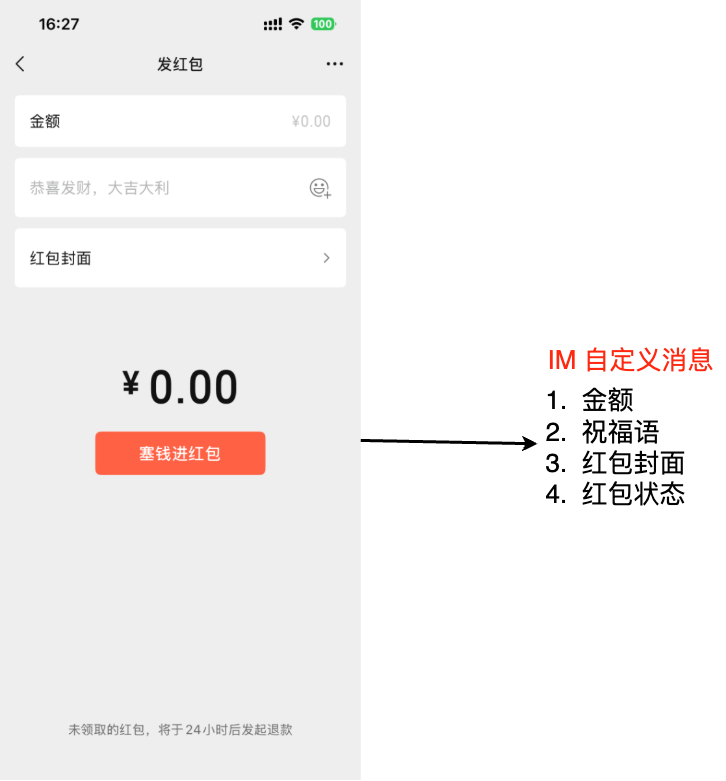 packet_id | String | 发送方调用红包系统创建红包,支付系统扣款成功后,由红包系统生成唯一 packet_id ,红包系统通过 REST API 将它写入 IM 自定义消息的 customData,使消息与红包一一绑定。 |