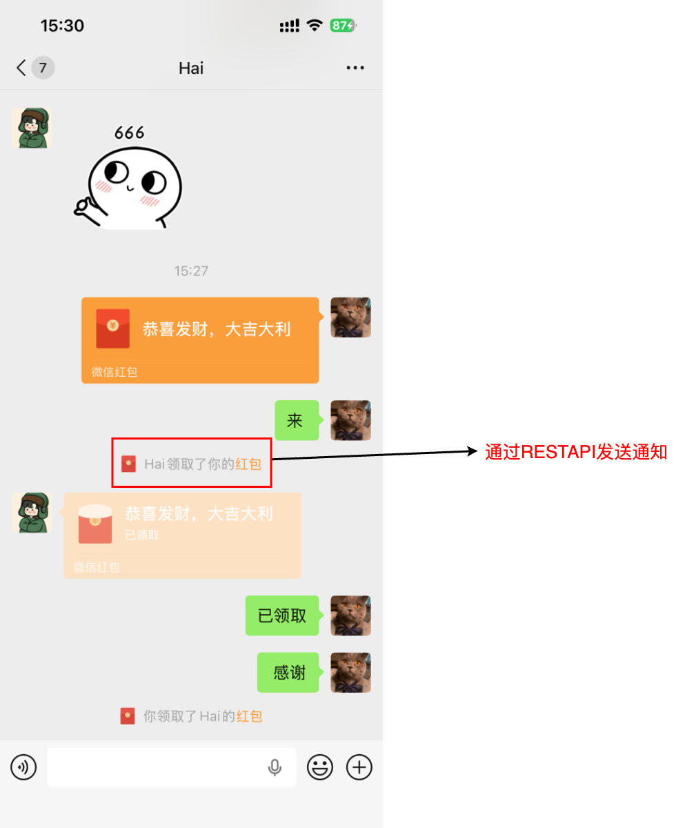 消息变更 | 更新红包状态(Unopened → Opened → None left) | From_Account + To_Account + MsgKey | GroupId + MsgSeq |