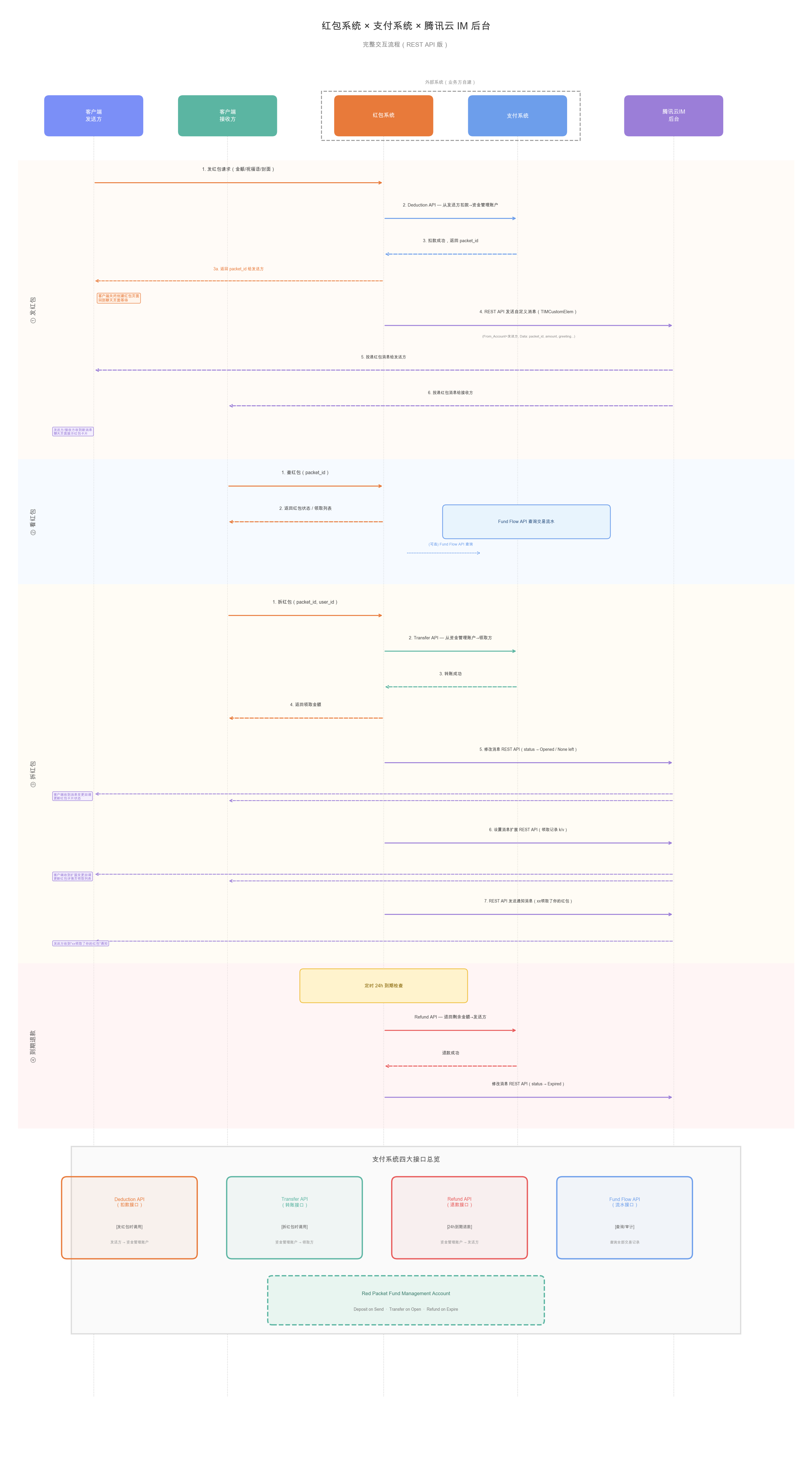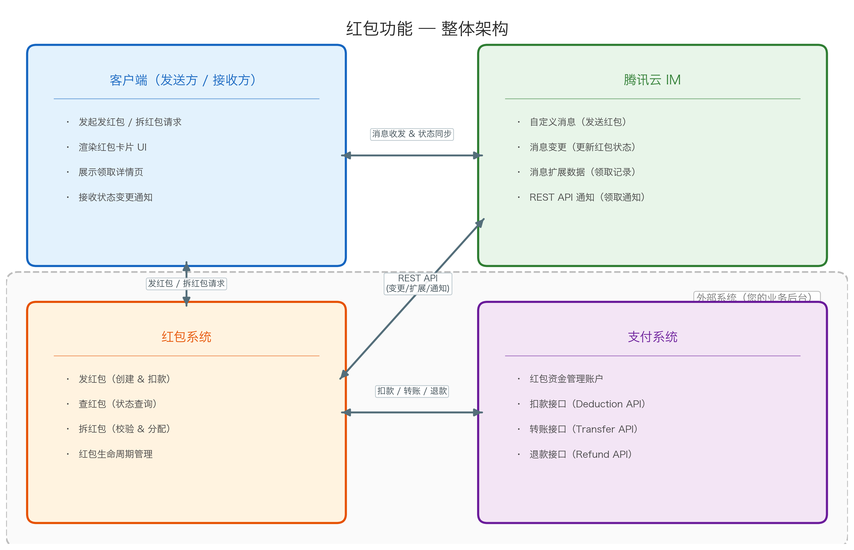 | 状态一致性 | 通过消息修改接口保持红包状态在所有客户端的同步。 |