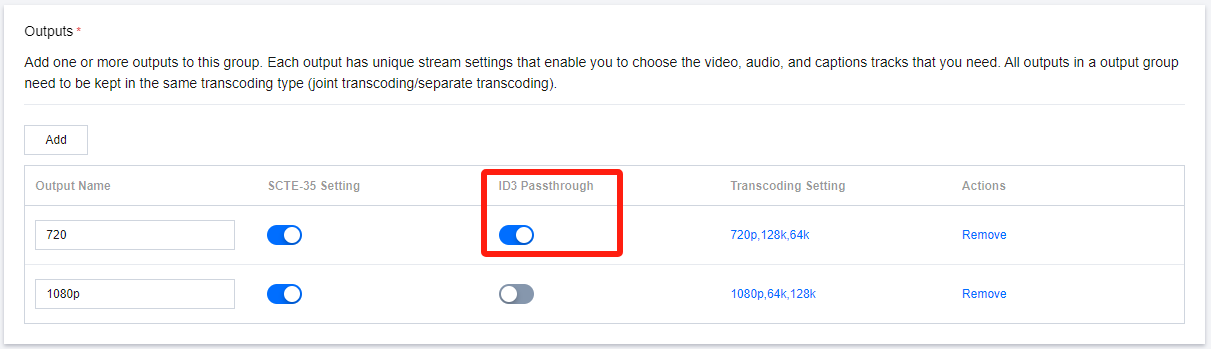 ID3:请参考 ID3说明文档,输入以 base64 编码的 ID3 元数据,最大长度为1024个字符。 此外,对于在此频道中需要透传 ID3 元数据的 Output,需要在 Output 中开启 ID3 Passthrough 开关。