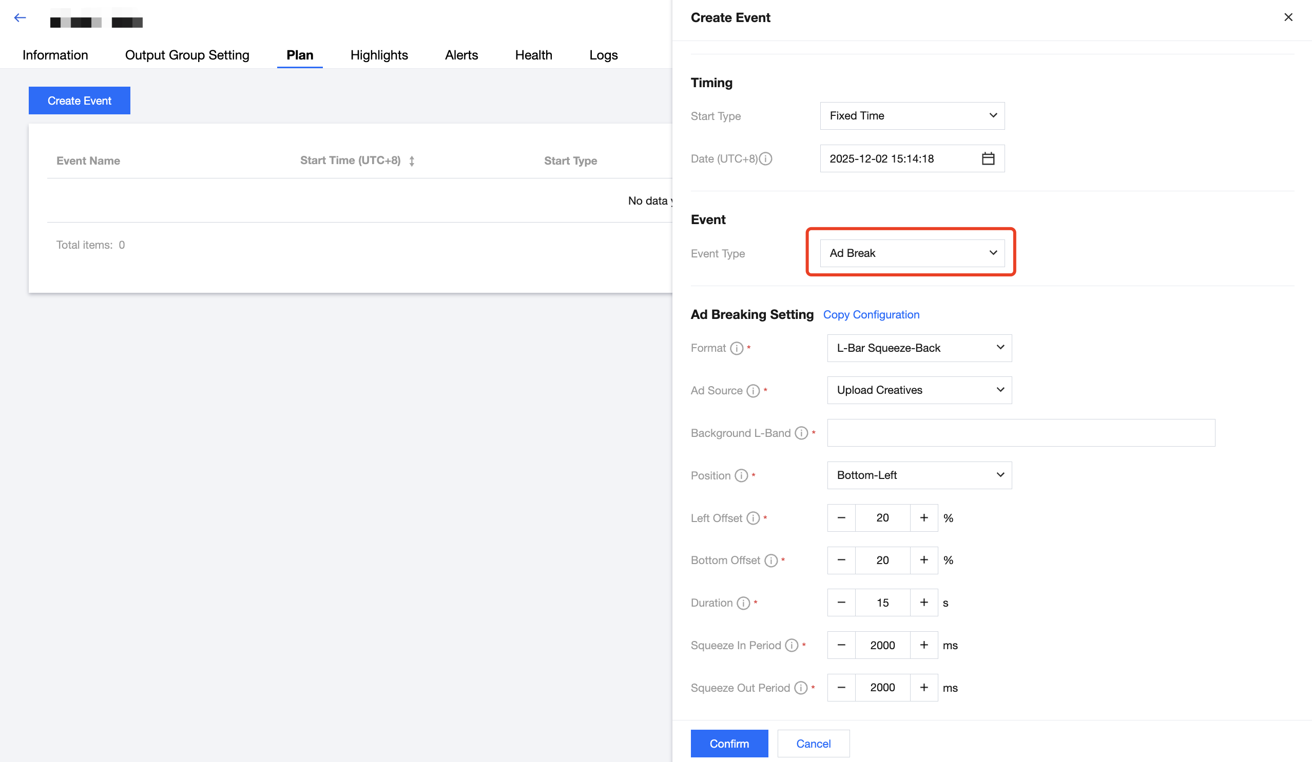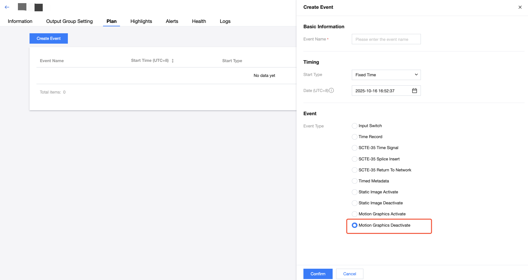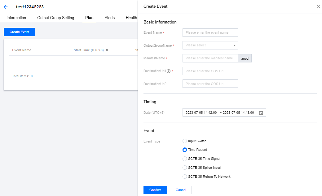 登录 StreamLive 控制台,在 Channel 中,单击需要设置 Plan 的频道名称,进入频道详情页面,然后选择详情页中的 Plan 标签页,即可看到当前频道下的 Plan 列表: 创建事件