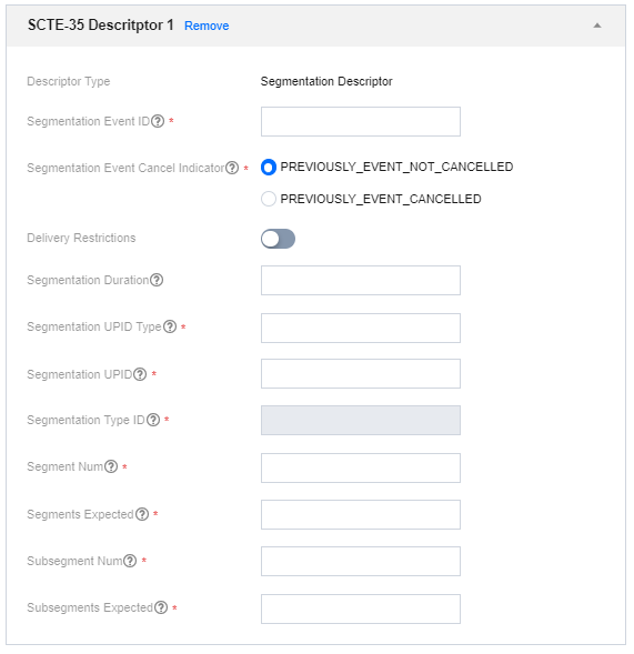 Segments Expected:对应 SCTE-35 segment_expected 参数。支持整数,最小值为0、最大值为255。