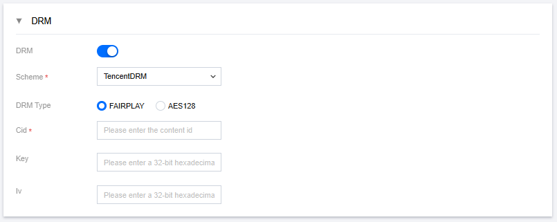 选择 FAIRPLAY、WIDEVINE、PLAYREADY 时,需要填写以下信息: