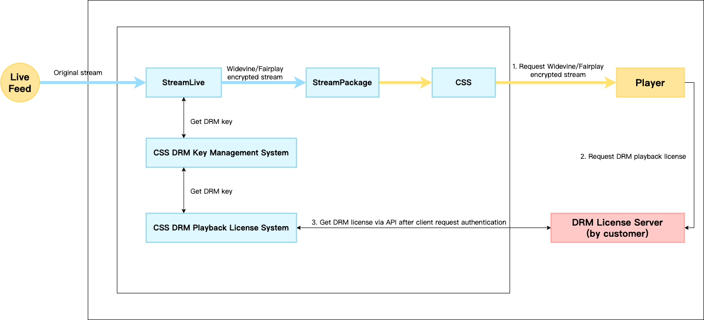 此外,TencentDRM 由 腾讯云直播 CSS 提供密钥管理能力,各产品间的交互流程可以参考下图: 注意:
