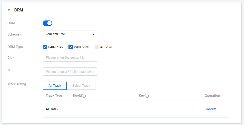 如您使用的 DRM 系统没有单独为不同类型 Track 提供密钥,则您可以使用 All Track 统一设置。当 DRM Type 为WIDEVINE 时,如果需要为不同类型 Track 提供密钥,则可以选择 Select Track,支持选择 AUDIO、SD、HD、UHD1、UHD2五种类型的 Track,每个 Track 单独配置各个的 KeyId 和 Key。