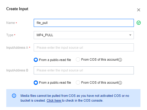 由于轮播是播放的已有文件,所以一般会选择 MP4_PULL 或 HLS_PULL 类型的 Input 做为输入源。若当前 Channel 中无此类型的 Input,则需要提前绑定好,然后进行 Plan 配置。一个典型的 PULL 类型的 Input 配置如下,可以同时设置两个源地址,用于容灾切换。Address 中可以输入一个可以公网访问的地址或一个具备公有读属性的腾讯云 COS 地址。