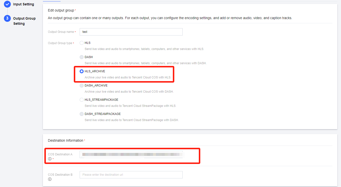 设置方式为在 Channel 的 Output Group Setting 中,需要将 Output Group Type 选择为 HLS_ARCHIVE/DASH_ARCHIVE,并在 COS Destination 中填写包含存储路径的 COS URL 地址。在 Channel 运行期间,直播文件将会实时归档到 COS 中。