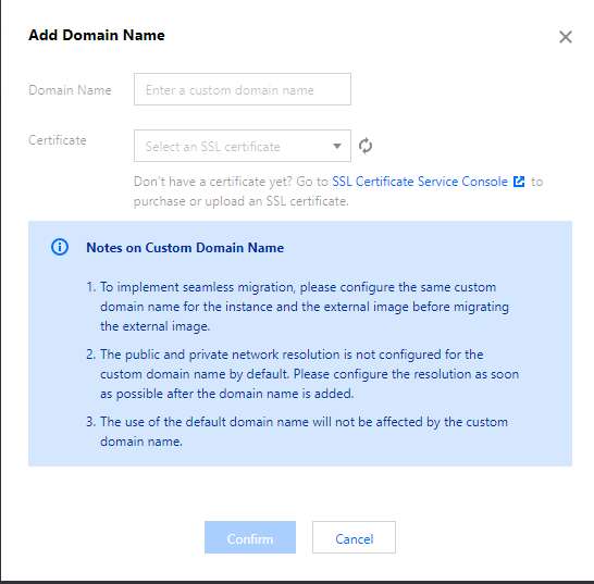 如果您的自定义域名已经在工信部备案且在域名服务控制台添加解析,请直接在“域名”输入框填写您的自定义域名,并选择证书。