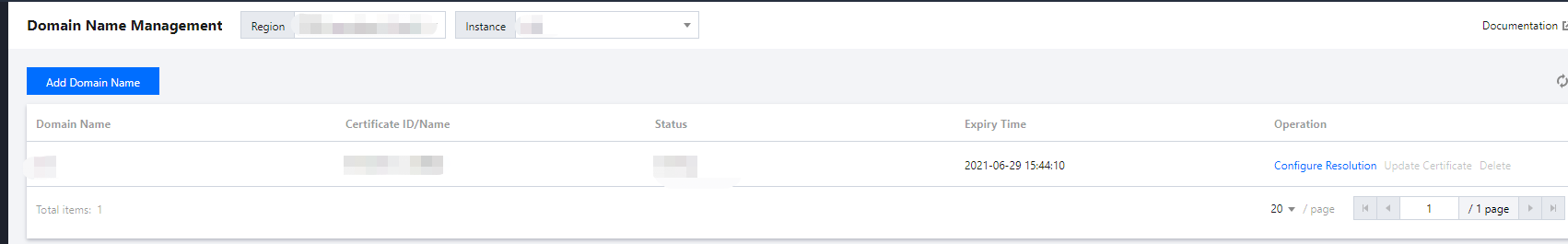2. 在“域名管理”页面选择需要添加自定义域名的实例地域和实例 ID。