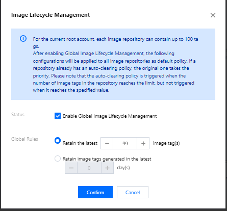 保留最新镜像版本:请按需设置,所设置数值不能大于当前主账号下镜像版本默认配额数。