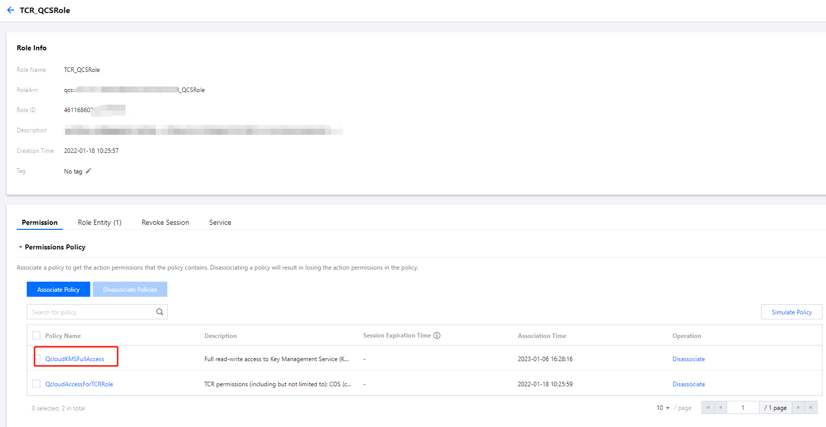 3. 在 TCR_QCSRole 角色详情页,关联预设策略 QcloudKMSFullAccess,如下图所示: