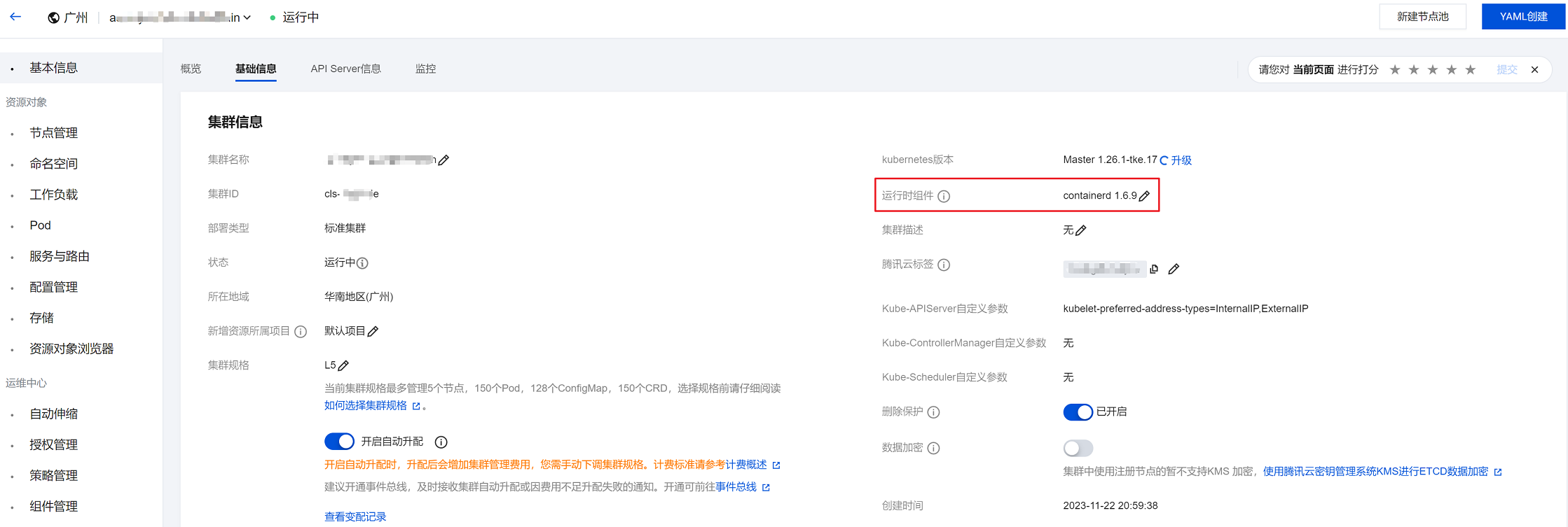 集群运行时组件版本可以在 容器服务控制台 中查看,单击集群名称,在集群基本信息页面,查看基础信息,可以看到运行时组件和版本信息。如下图所示: 集群操作系统为 Ubuntu,TencentOS,CentOS。如果使用 CentOS,需要在集群节点上执行 yum install -y fuse 安装 fuse 应用。