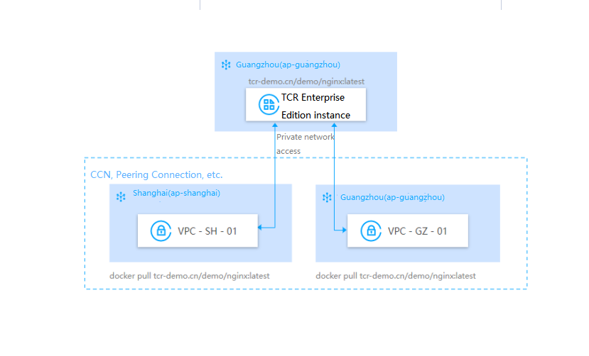 本文主要介绍企业客户如何使用自定义域名,并配合云联网、对等连接,PrivateDNS 产品实现多私有网络 VPC 同时支持接入 TCR 实例,并正常通过内网分发容器镜像。