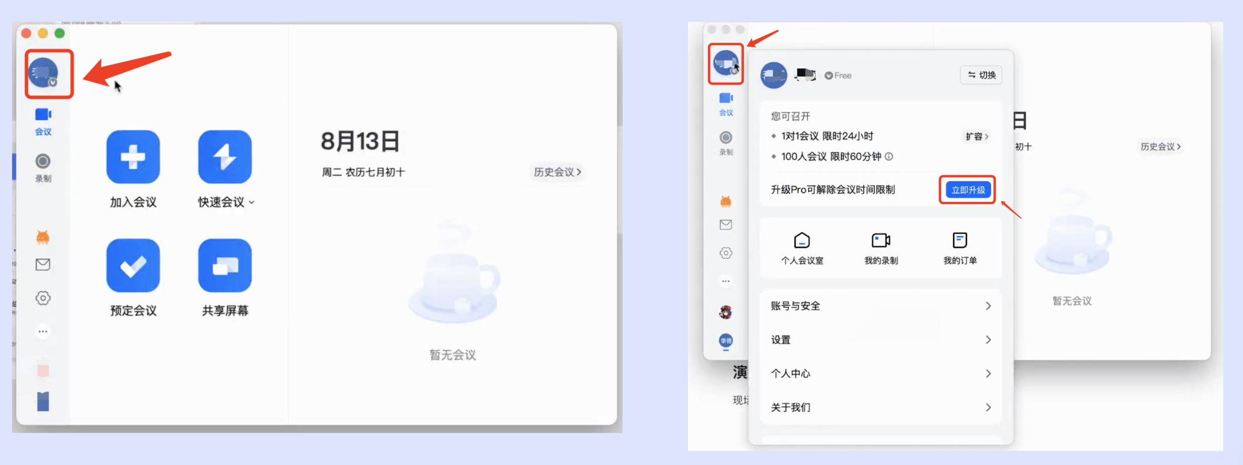 2. 登录 Free 版账号后,您可以在 VooV Meeting 客户端单击自己的头像,在个人资料卡中单击立即升级,即可购买会员。