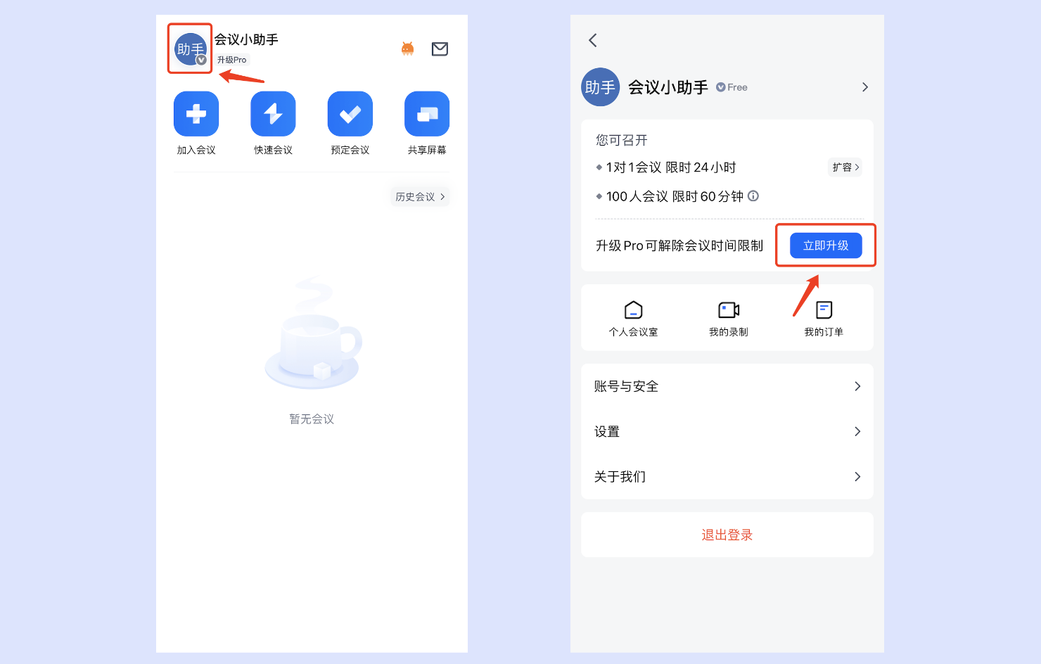会议人数上限与时长由会议发起者的账号版本决定。当您参加任一版本用户发起的会议时,您都无需额外付费。
