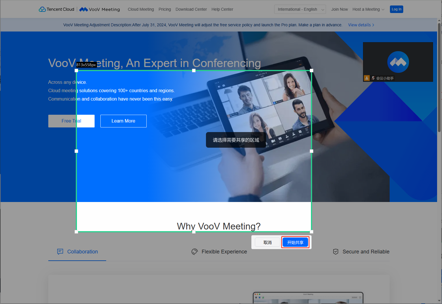 3. 选中共享区域后,会出现取消和开始共享,单击开始共享即可将所选择的屏幕区域共享到会议,单击取消即可退出共享。