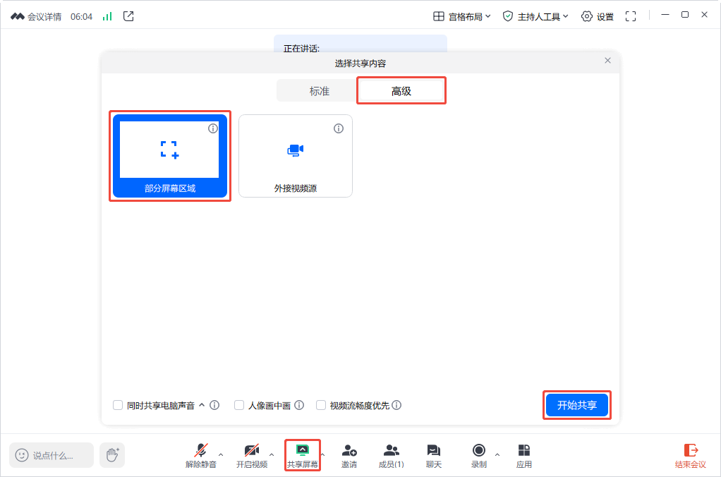 2. 单击高级,选中部分屏幕区域后,单击开始共享即可开始选择共享区域。