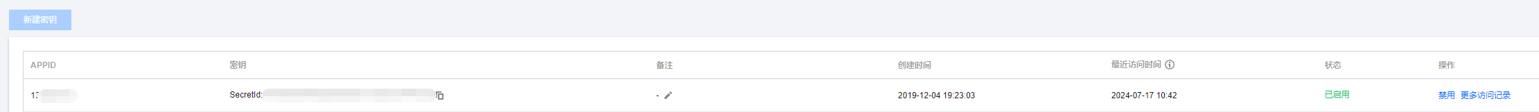 A. 进入 云 API 密钥管理 页面,在左侧导航栏选择访问管理 > API 密钥管理,进入 API 密钥管理页面。 B. 单击新建密钥创建密钥,并保存 SecretId 和 SecretKey 供后续 API 调用传参。(如果您已经具有腾讯云密钥,请跳过本步骤。)
