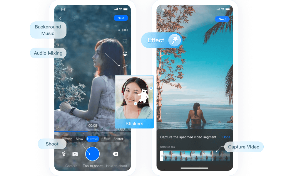 | 背景音乐 | 拍摄前可以选择本地的 MP3 作为背景音 | × | ✓ | ✓ |
