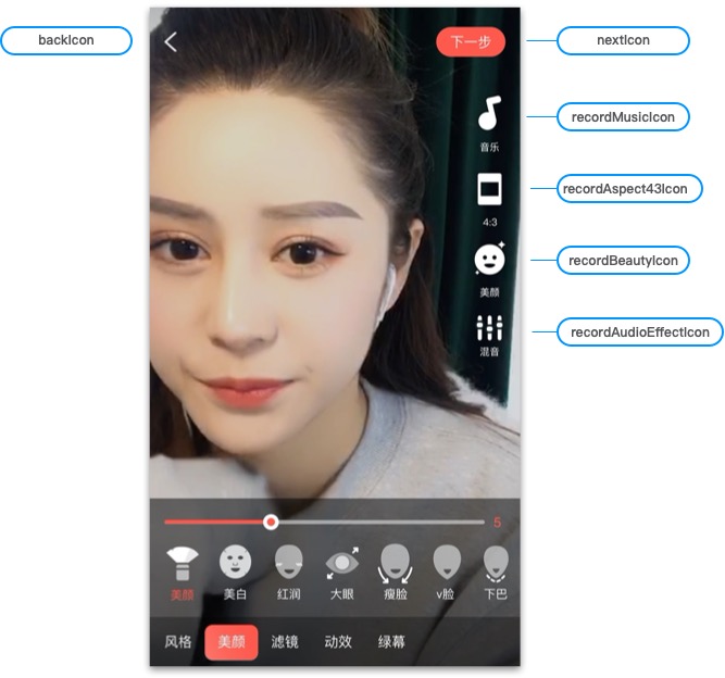 UGCKitTheme *theme = [[UGCKitTheme alloc] init];theme.nextIcon = [UIImage imageName:@"myConfirmIcon"]; // 修改完成按钮图标theme.recordMusicIcon = [UIImage imageName:@"myMusicIcon"]; // 设置“音乐”功能图标theme.beautyPanelWhitnessIcon = [UIImage imageNamed:@"beauty_whitness"]; // 设置”美白“效果图标UGCKitRecordViewController *viewController = [[UGCKitRecordViewController alloc] initWithConfig:nil theme:theme]; // 使用自定义主题创建控制器