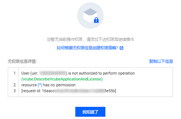 若您仅需要提供子账号查询 License 的权限,请授权 QcloudVCUBEReadOnlyAccess 策略。