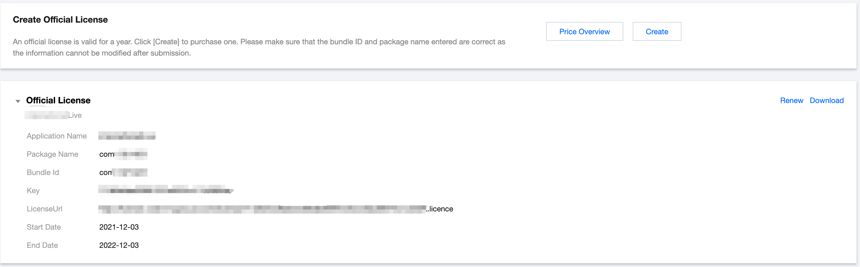 3. 测试版 License 成功创建后,页面会显示生成的 License 信息。在 SDK 初始化配置时需要传入 Key 和 License URL 两个参数,请妥善保存以下信息。