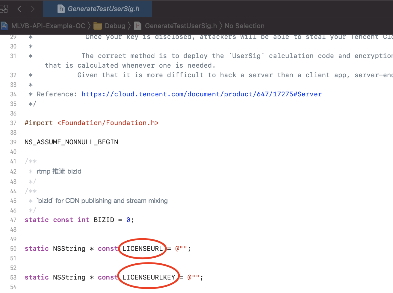 5. 打开LiteAVSDK_Live_iOS_版本号/MLVB-API-Example-OC/Debug/GenerateTestUserSig.h文件。