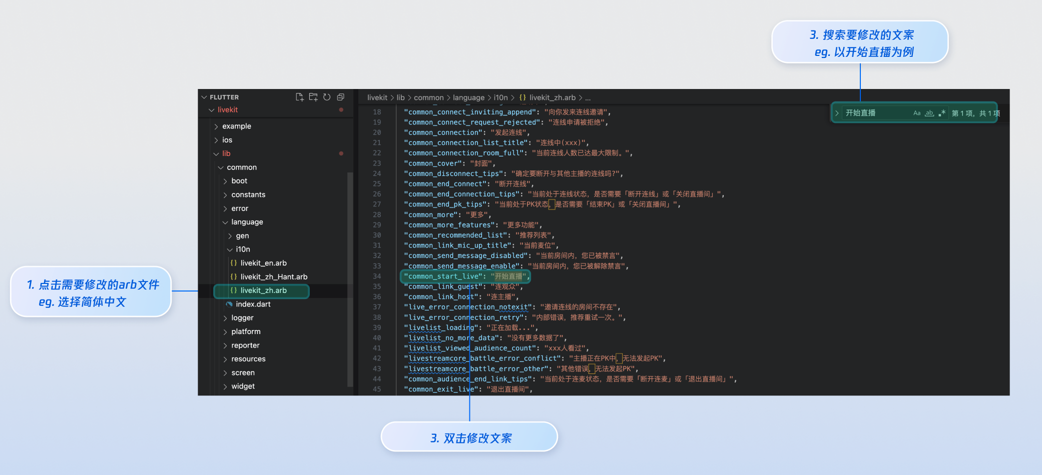 livekit/lib/common/language/i10n/ 目录下的ARB文件来修改需要调整的文案: