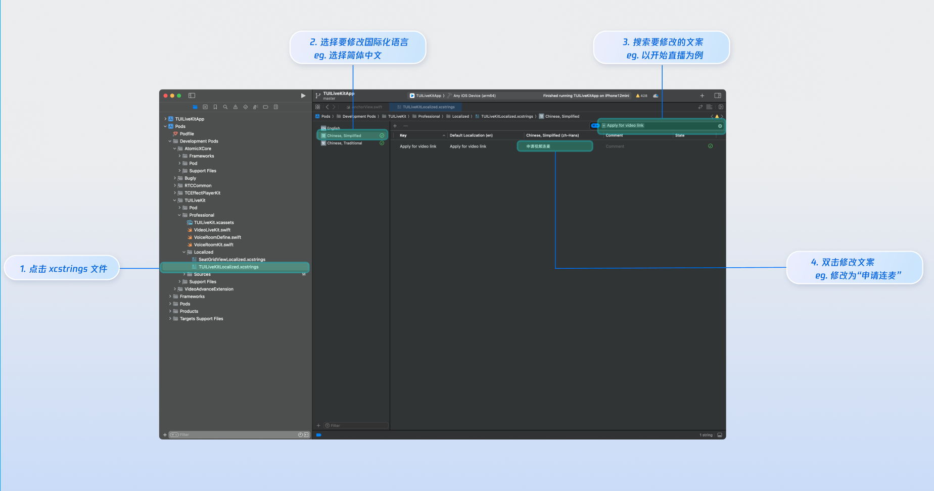 TUILiveKit.xcassets 管理 UI 所需的图片资源,您可以借助 Xcode 图形化工具快速修改自定义界面所需的图标。