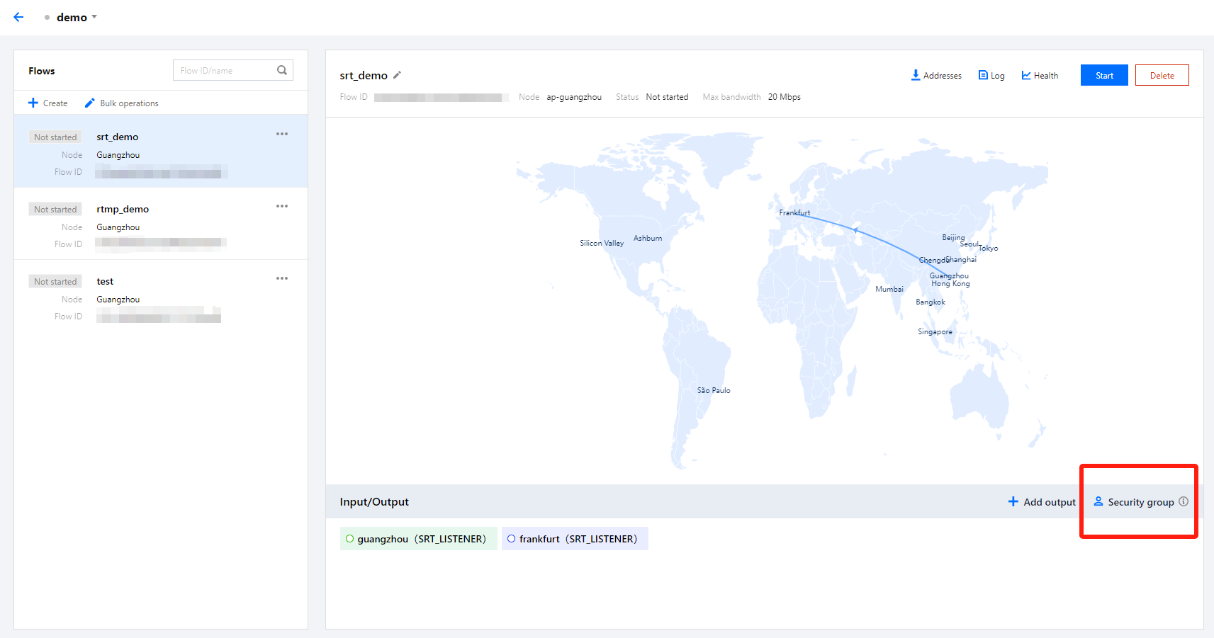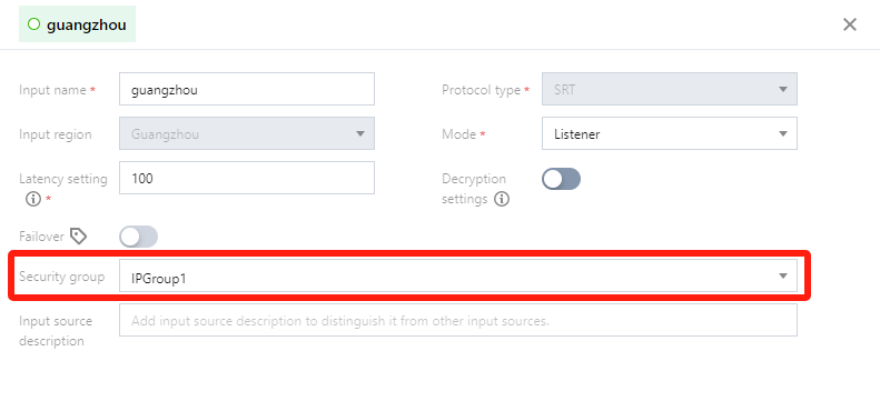 对于输入协议:SRT Listener、RTMP、RTP,和输出协议:SRT Listener、RTMP_PULL、RTSP_PULL,可以对输入/输出节点在详细信息中绑定安全组。例如:对于 SRT Listener 的输入,在安全组中绑定了 IPGroup1,那仅有在此白名单中的 IP 可以向这个输入节点进行推流。