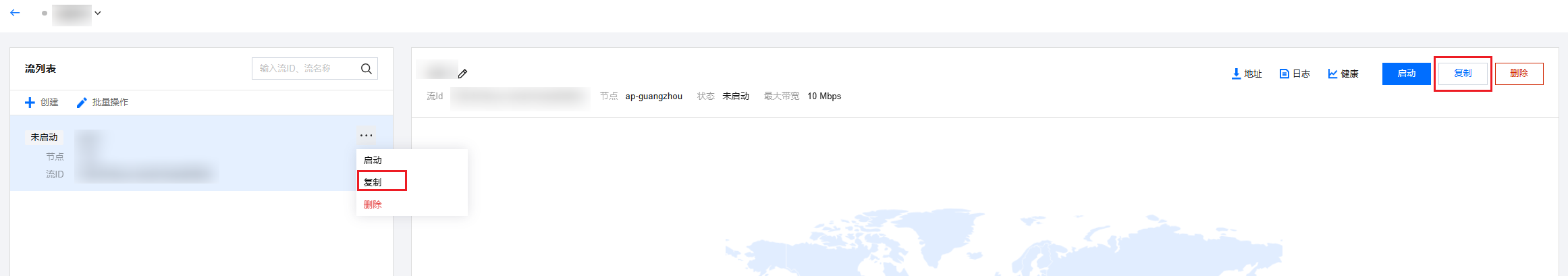 3. 在复制功能中,可以重新设置新流的事件名称、流名称、最大带宽、Input 名称、Input 地域、Input 可用区、Output 名称、Output 地域、Output 可用区。其它信息不能进行设置,会默认与原流一致。