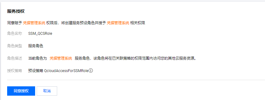 凭据管理系统将借助密钥管理系统(KMS)实现对敏感凭据的加密存储,因此在使用凭据管理系统前,请确认已开通 密钥管理系统。 为保障凭据管理系统功能的正常使用,请开通 KMS 对凭据管理系统服务的角色授权。您可前往 访问管理 进行授权设置。 开通 KMS 服务并进行授权的操作步骤如下: