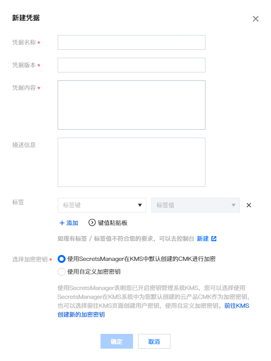 凭据名称:名称长度1 - 128字节,使用字母、数字、连接符(-)、下划线(_)的组合,首字符必须为字母或者数字。