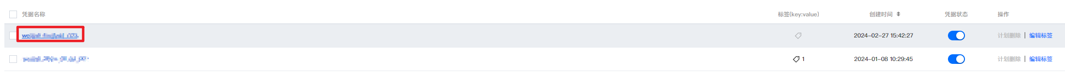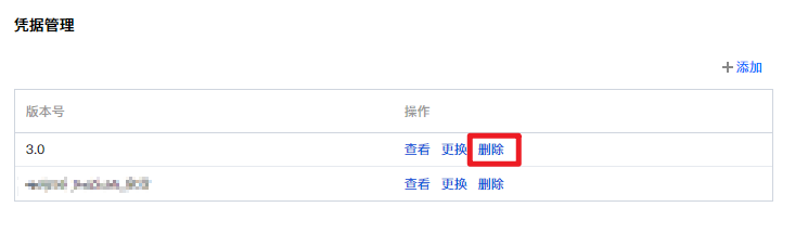 4. 凭据添加完后,如需删除,可以在对应版本右侧操作栏,单击删除,在弹出的删除确认框中,确认删除即可。