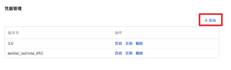 1. 登录 凭据管理系统控制台 ,在左侧导航栏中,单击凭据列表,在凭据列表左上方可以切换不同地区,找到您需要添加凭据版本的凭据,单击凭据名称进入凭据详情页。 2. 在凭据管理区域,单击添加,进入添加凭据信息页面。