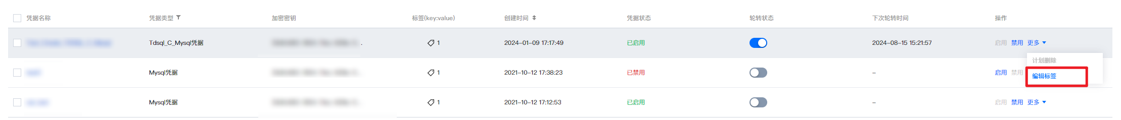 1. 找到需编辑标签的凭据,选择其右侧的编辑标签。