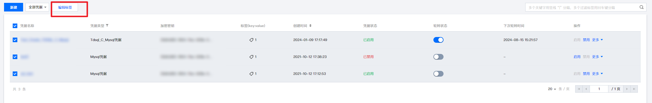 1. 勾选需编辑标签的凭据,点击凭据顶部的编辑标签。