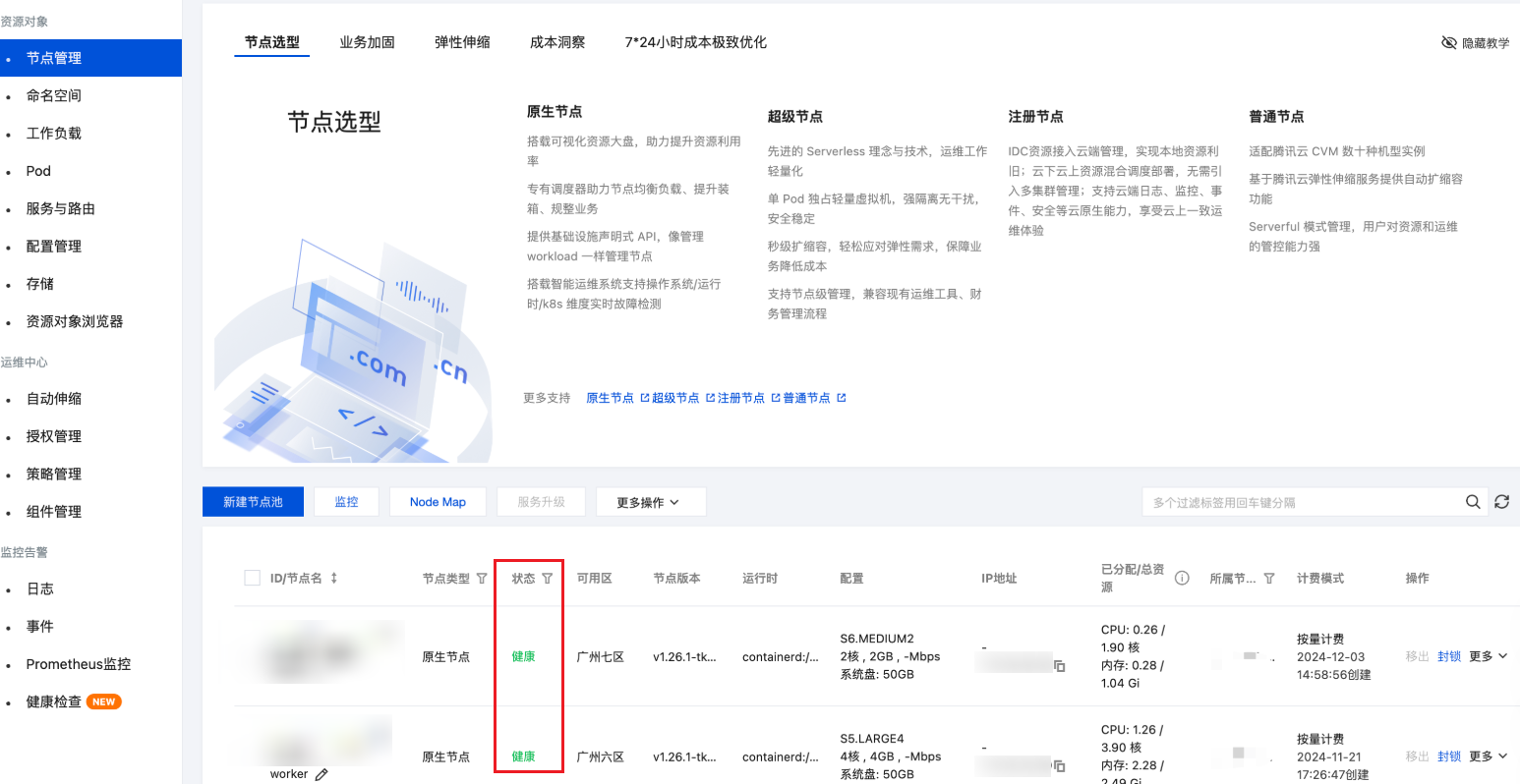 新建容器节点:在容器服务集群中购买一个新的原生节点,并在节点上部署需要测试的服务,确保该节点上有运行中的 Pod。