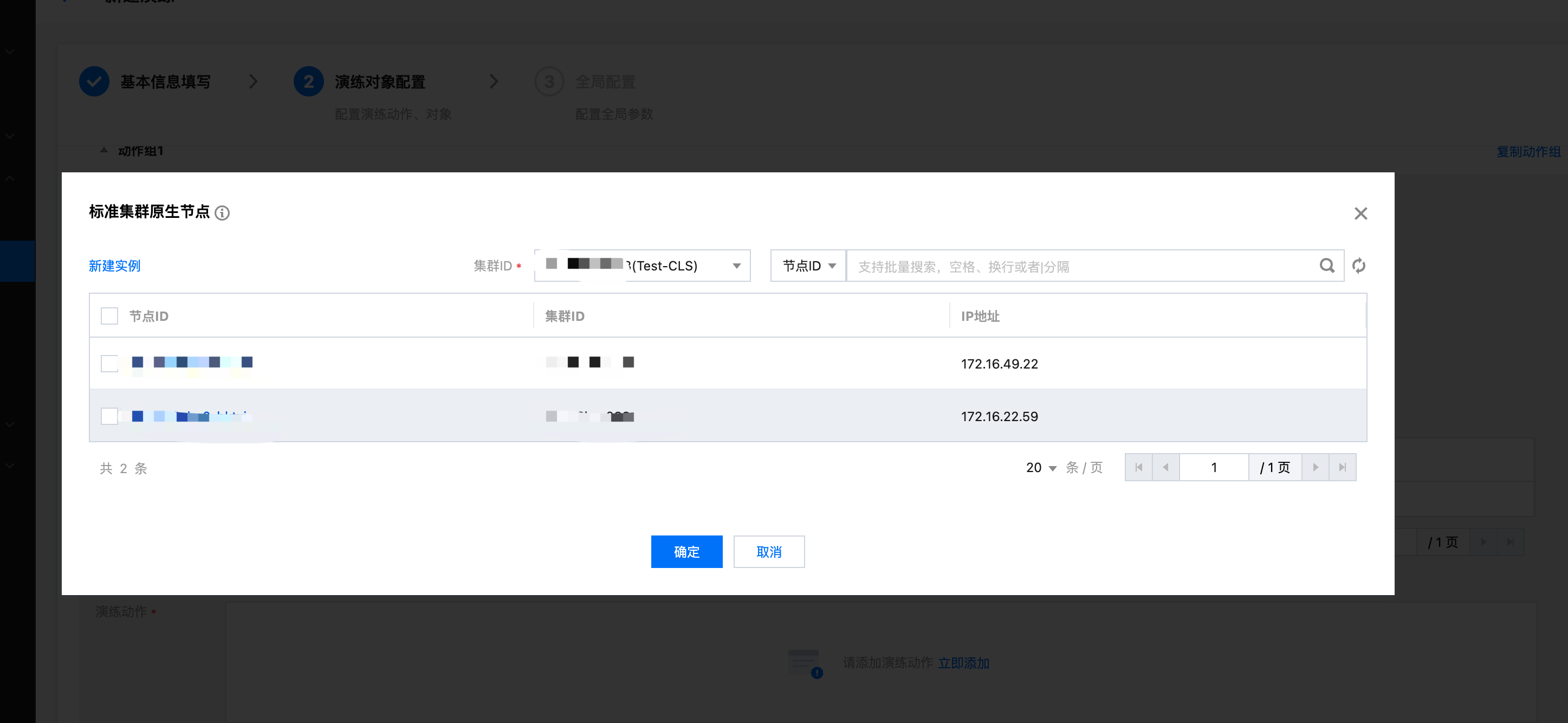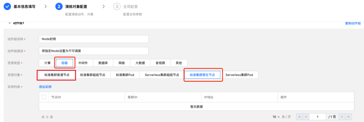 5. 进入演练对象配置页面,填写动作组编排信息。其中,资源类型选择容器,资源对象选择标准集群普通节点或标准集群原生节点。