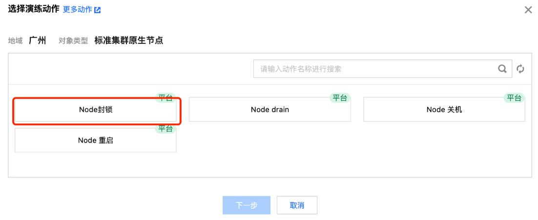 8. 选择 Node 封锁故障动作,单击下一步。