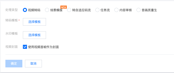 视频转码 | 支持进行如下选择: 单击转码模板:选择您已在 模板设置 中创建的转码模板,可勾选多个转码模板。 单击常用模板:自动选择您已设定好的常用转码模板,可通过单击操作栏的删除按钮进行删减。 | 支持进行如下选择: 单击不用水印。 单击默认水印:自动选择您已设定好的默认水印模板。 单击选择水印:选择已在 模板设置 中创建的水印模板。
