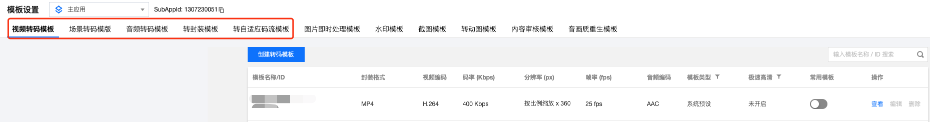 1. 进入 云点播控制台,在非管理员页面下,进入具体应用页面,选择左侧导航栏的媒体处理设置 > 模板设置。 2. 选择视频转码模板,然后单击创建转码模板进入模板自定义设置。