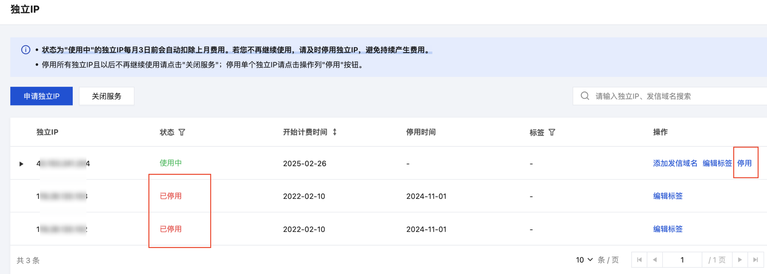 停用操作成功进行后,状态会转为“已停用”,将会停止继续计费。