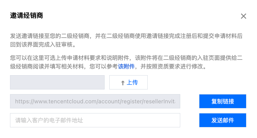 2. 单击邀请经销商,复制邀请链接后直接发送或输入邮件地址通过邮件将邀请链接发送给二级经销商。