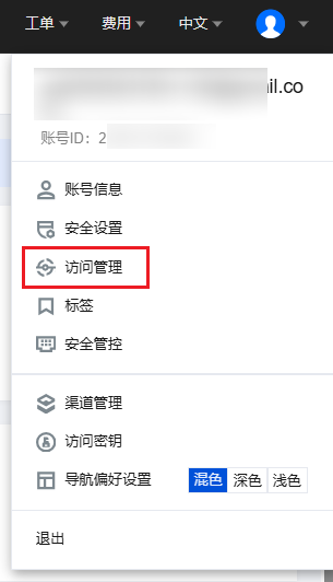 3. 登录后进入控制台首页,将鼠标悬浮在账号名称处,单击访问管理。