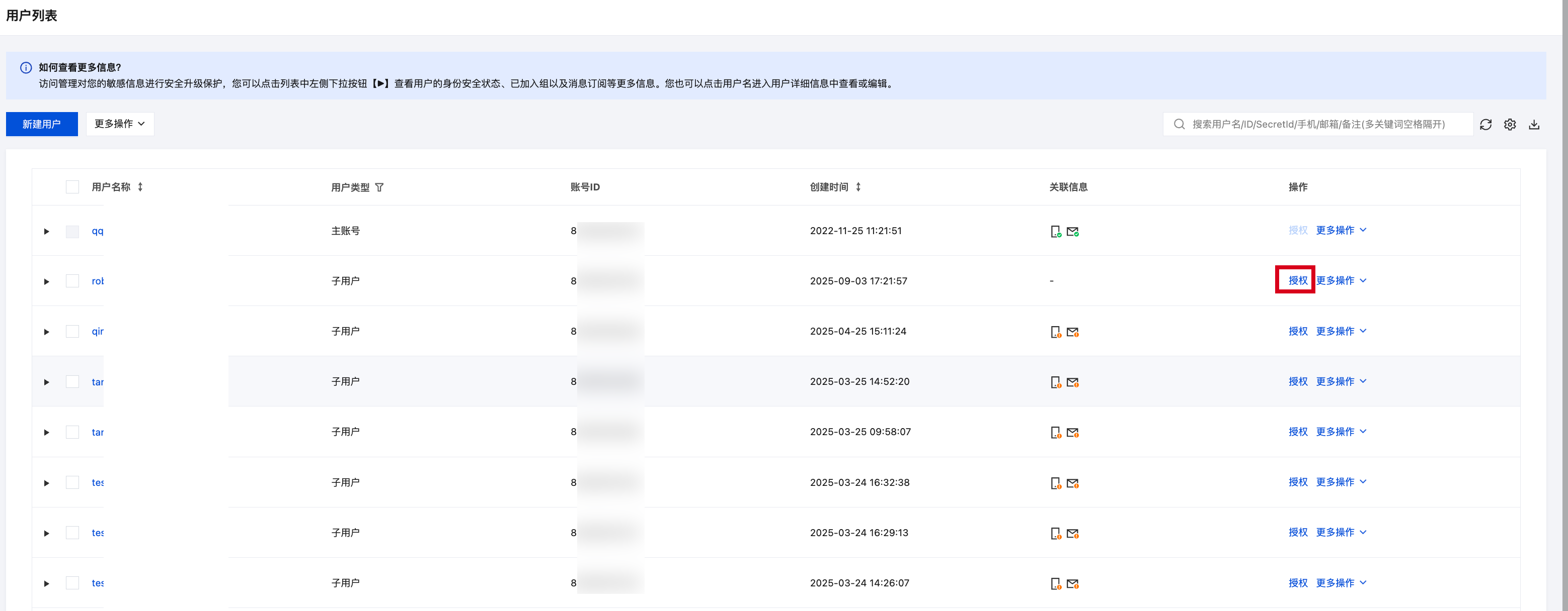 4. 选择用户 > 用户列表,在员工子账号的操作列下单击授权。