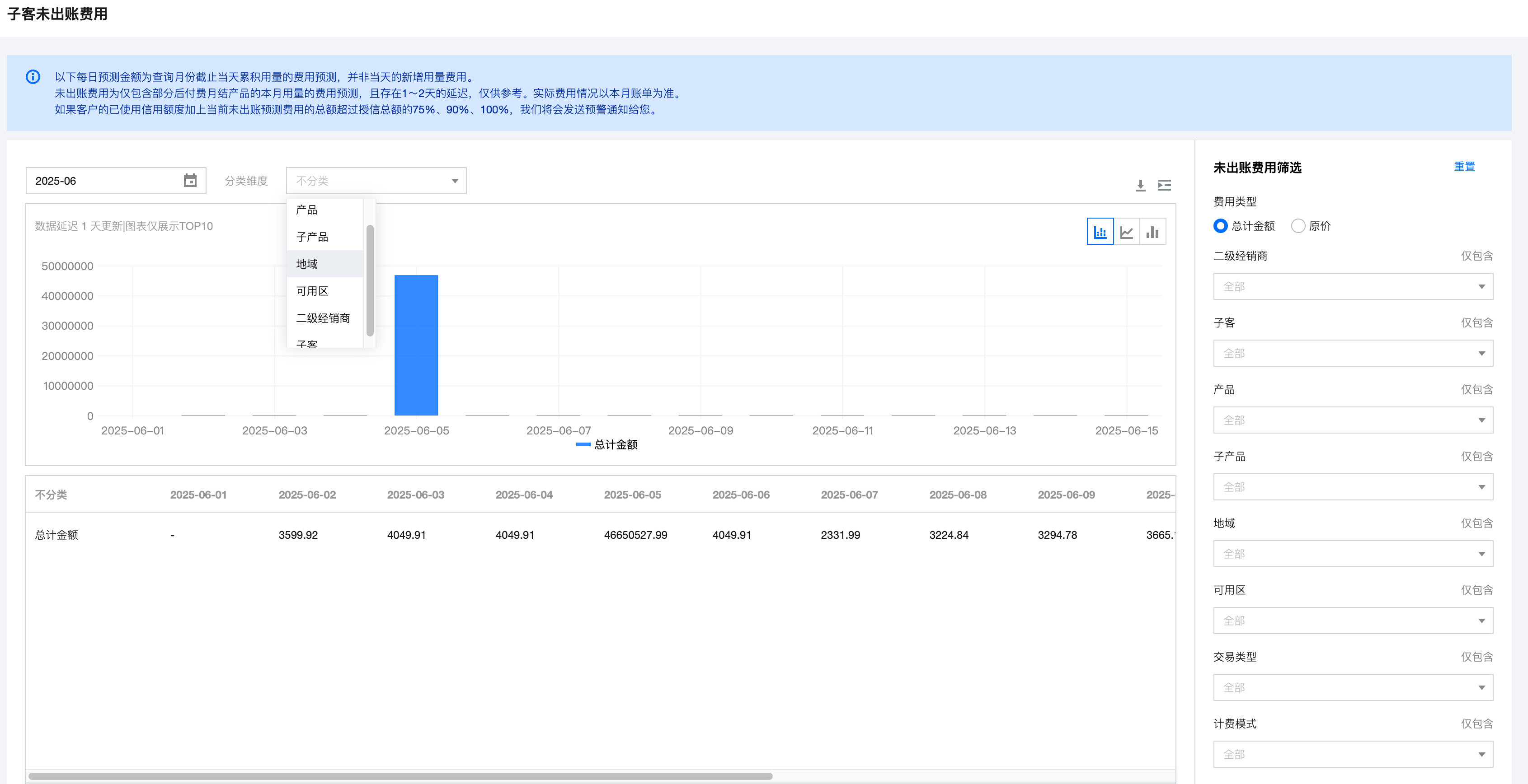 筛选项支持:费用类型(总计金额,即子客折扣价、原价)、产品、子产品、地域、可用区、交易类型、计费模式。